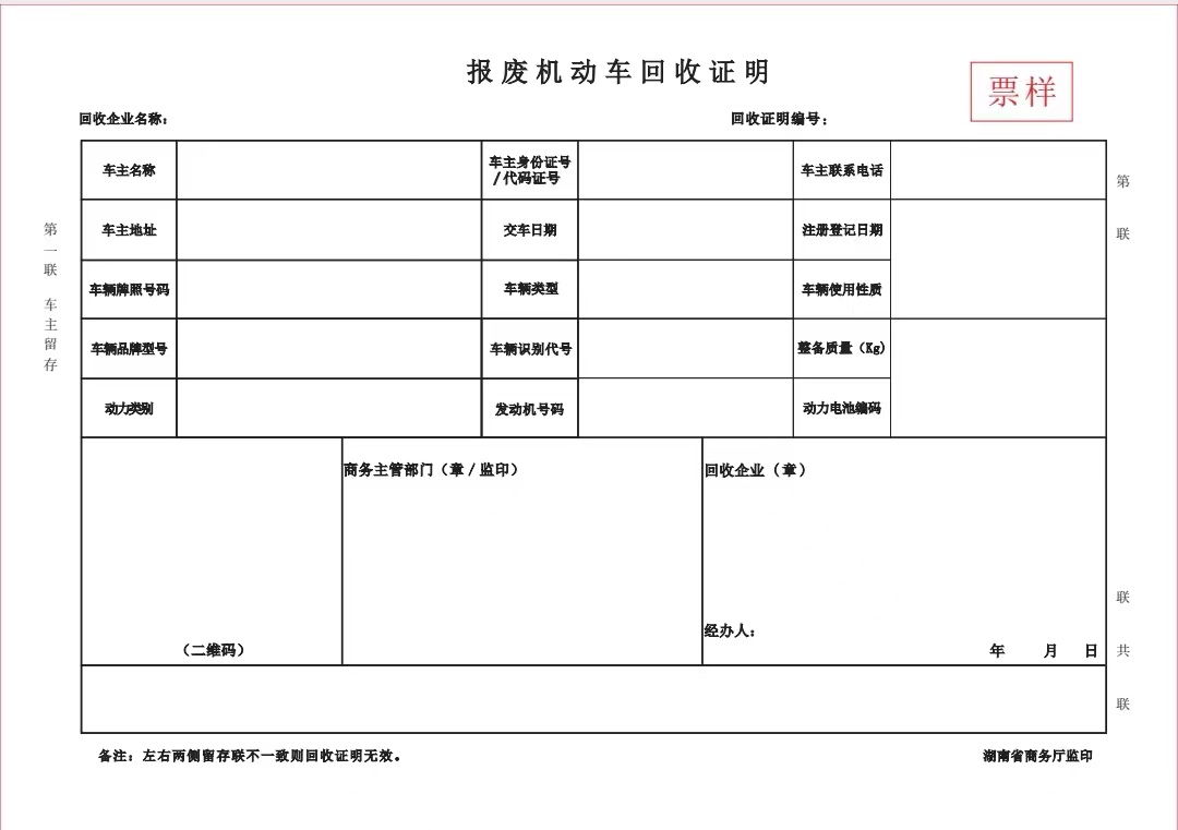 (四)出具《報(bào)廢機(jī)動(dòng)車回收證明》的企業(yè)必須是有資質(zhì)的報(bào)廢機(jī)動(dòng)車回收拆解企業(yè);開具《機(jī)動(dòng)車銷售統(tǒng)一發(fā)票》的企業(yè)登記注冊(cè)地必須在湖南省。