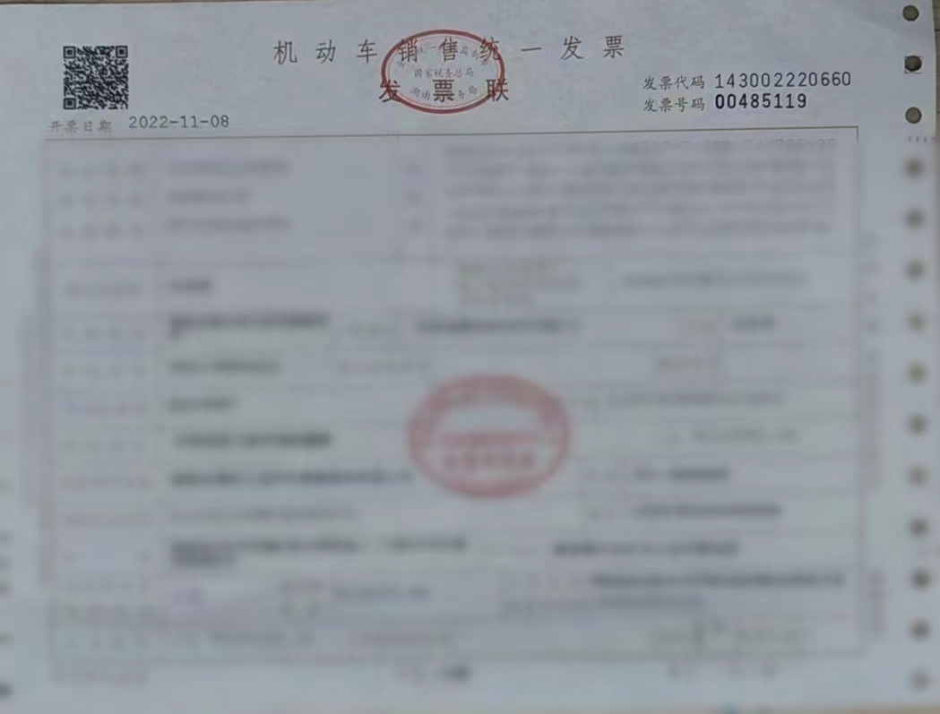 購(gòu)買新能源乘用車新車的《機(jī)動(dòng)車銷售統(tǒng)一發(fā)票》照片。