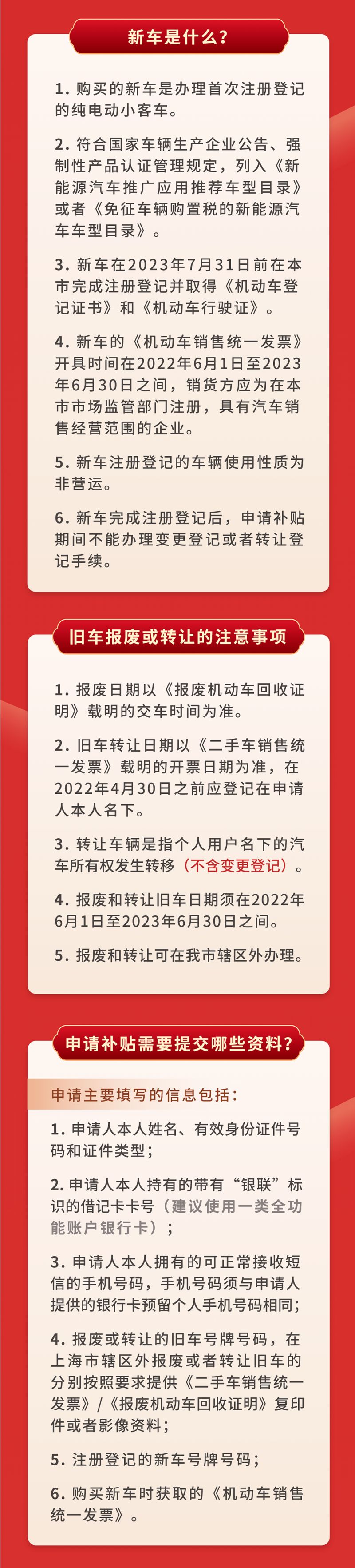 2023年6月30日前,個(gè)人消費(fèi)者報(bào)廢或轉(zhuǎn)出名下在上海市注冊(cè)登記且符合相關(guān)標(biāo)準(zhǔn)的小客車,并購(gòu)買純電動(dòng)汽車的,給予每輛車10000元的財(cái)政補(bǔ)貼。